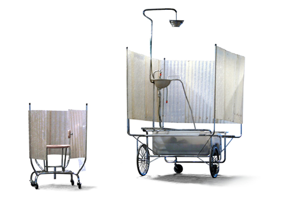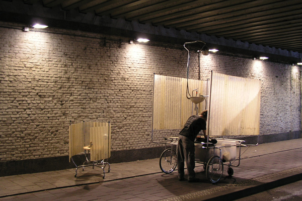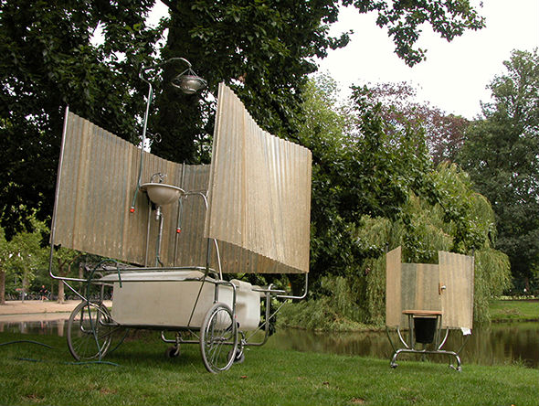 Mobile bathroom made of used materials with bathtub, shower, sink and separate toilet unit. Project in cooperation with Vladi Rapaport and Jörgen Smit. Nominated for the 'MS Research Kunstprijs 2006.'